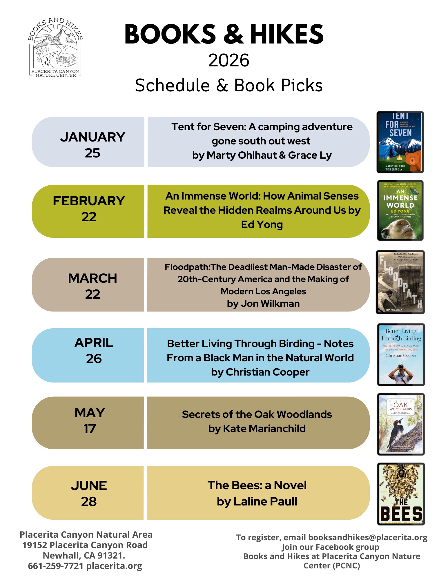 Books & Hikes: Meets the 4th Sunday of the month at 9AM September through May, 8AM June through August. See flyer below for a list of upcoming books for July 2025 through January 2026. Please note we are dark for the month of December.